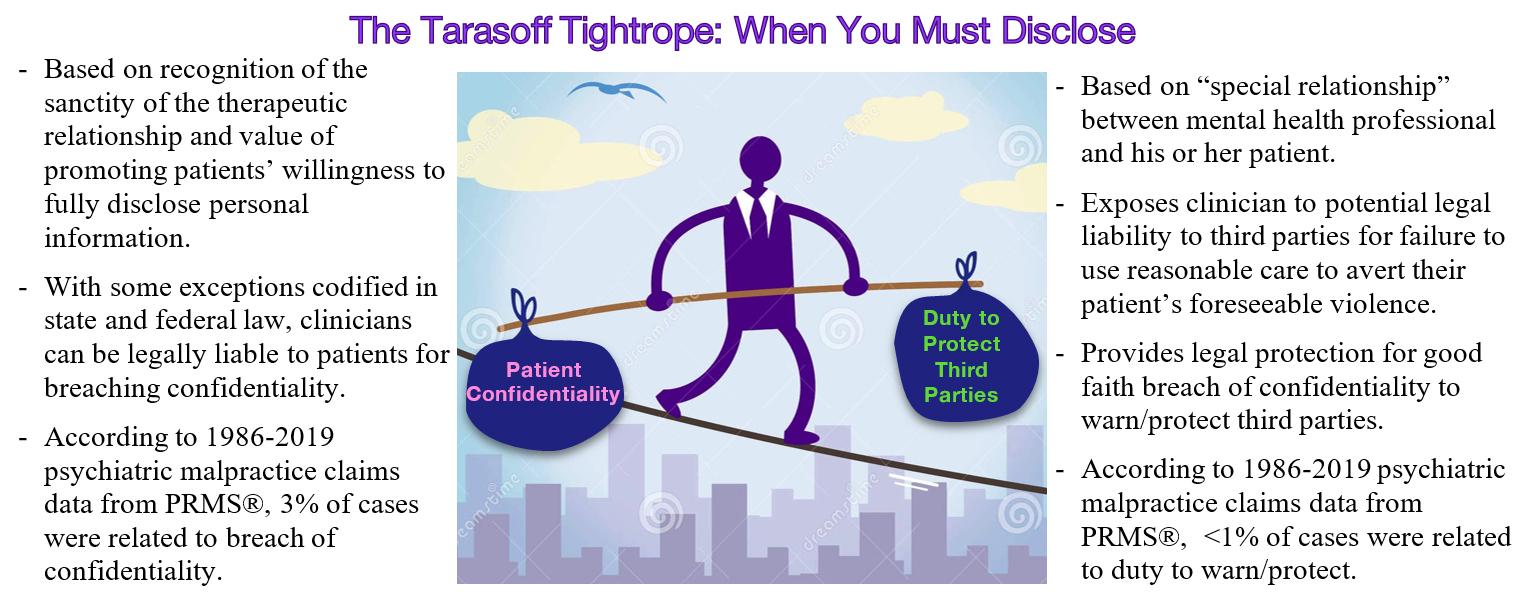 - A clinician must weigh the patient’s right to confidentiality with their legal, ethical, and clinical duties to protect potential victims of their patient’s violence.