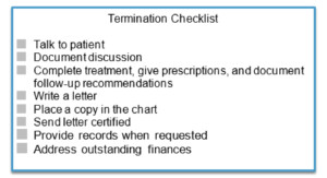 - Style the termination process to the patient. Address the reasons for your decision specific to this patient. Personalize it to reflect the patient’s treatment needs and your recommended follow-up for termination.